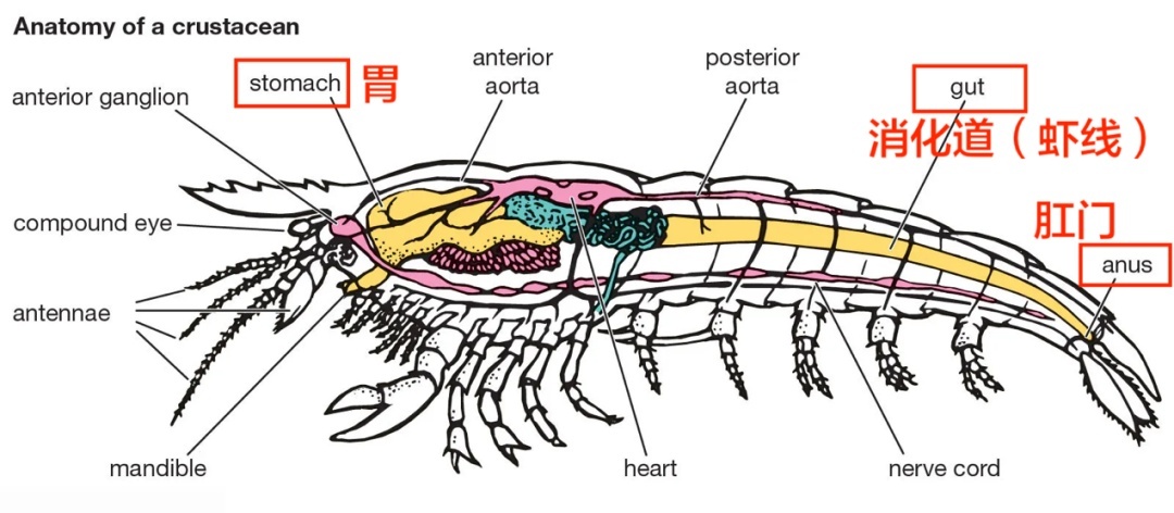 以虾为代表的甲壳类解剖示意图。虾线本质上是贯穿全身的消化道,食物和泥沙经消化后只能通过肛门排出,并不存在像贝类那样通过鳃部“吐沙”的生理机制。| Britannica